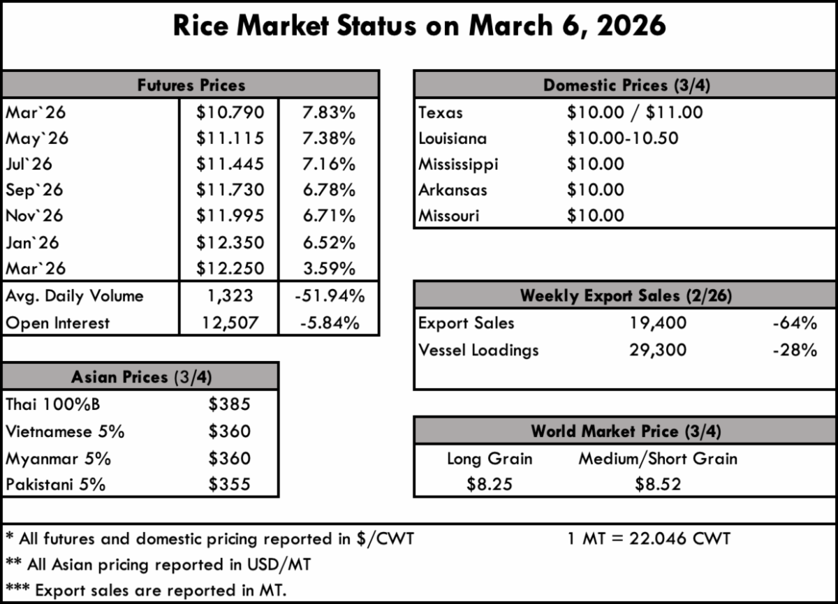 Planting intentions are coming in to focus, as price action continues to move at a snail’s pace. In light of the recent strikes on Iran, the grains complex, and more specifically U.S. long grain prices, have not moved much—yet. It is still very early for there to be direct impacts from the war, but there are more subtle elements at work. First, in wartime, it is typical for the U.S. Dollar to increase in value against other global currencies as it is deemed safer than alternative global currencies. This, naturally, has a negative impact on exports. Secondly, and conversely, Iraq is one of the most strategic partners for milled U.S. long grain rice, and it’s typical for countries in conflict to stockpile basic food staples, of which rice is paramount. While there are only rumors of Iraq entering the conflict, it is something to watch. And third, what is making the news and directly impacting commodity and goods flow, is freight rates and the risk of shipping channels in the Middle East. This will have the most outsized impact short-term, but expect the first two factors to work their way into the matrix in the coming weeks if and when the war matures.